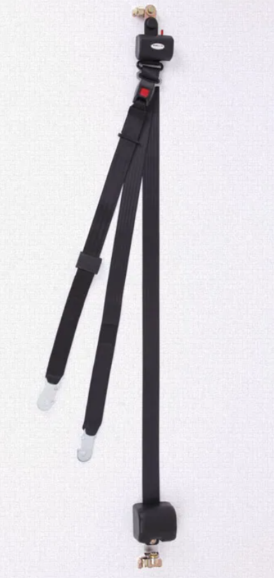 Dual Retractable Integrated Combination Belt with snap hooks to attach lap belt to D-rings on rear wheelchair tie-down retractor assemblies and a flat mounting bracket on the upper retractor.